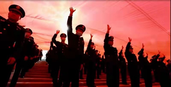 伴隨著激昂的樂曲,一面400平方米的巨幅黨旗緩緩展開,面向鮮紅的黨旗,在場的黨員干部和居民群眾心潮澎湃。100名黨員整齊列隊,在領(lǐng)誓人的帶領(lǐng)下舉起右拳,莊嚴(yán)宣誓,重溫入黨誓詞,回望入黨初心,抒發(fā)對黨忠誠的意志和信念。