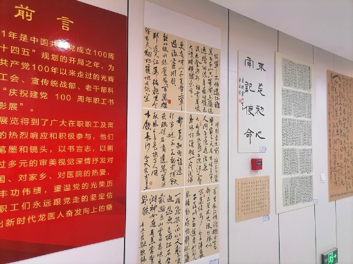 據(jù)了解,此次活動(dòng)共入展攝影作品41幅、書法作品15幅、繪畫作品13幅、手工制作5件、詩(shī)歌2首及微視頻4部,其中部分作品在該院門診五樓進(jìn)行了展示。攝影作品《守護(hù)》,作者是省醫(yī)院兒科副主任汪琪,通過鏡頭展現(xiàn)了醫(yī)務(wù)工作者的日常忙碌,及不知疲倦、一絲不茍的內(nèi)心世界;書法作品《紅船精神》,作者是省醫(yī)院南崗院區(qū)泌尿外一科主任楚寧,筆法嫻熟、清秀雋永,字里行間體現(xiàn)出堅(jiān)定理想、百折不撓的奮斗精神;書法作品《不忘初心》聯(lián)句,作者是省醫(yī)院南崗院區(qū)普外科姜峰奇,古樸自然,一顆紅心永向黨;繪畫作品《一唱雄雞天下白》,作者是省醫(yī)院退休老干部張克起,作品直接用畫面抒發(fā)革命浪漫主義情懷;繪畫作品《江山多嬌》,作者是省醫(yī)院退休老職工賈雨虹,用嬌美的花朵為黨的百年華誕獻(xiàn)禮。