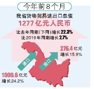 黑龍江日報(bào)訊(黑龍江日報(bào)全媒體記者 付宇)記者從哈爾濱海關(guān)獲悉,今年前8個(gè)月,我省貨物貿(mào)易進(jìn)出口總值1277億元人民幣,比去年同期(下同)增長22.3%,比2019年同期增長2.7%。其中,出口276.4億元,增長15.9%;進(jìn)口1000.6億元,增長24.2%。