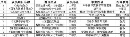 在參賽學生與指導教師的共同努力下,10項作品進入國賽(包括大數(shù)據(jù)應(yīng)用組、人工智能實踐組、數(shù)媒動漫與短片組、數(shù)媒靜態(tài)設(shè)計專業(yè)組、微課與教學輔助組、數(shù)媒游戲與交互設(shè)計組),最終喜獲全國二等獎4項,全國三等獎6項。