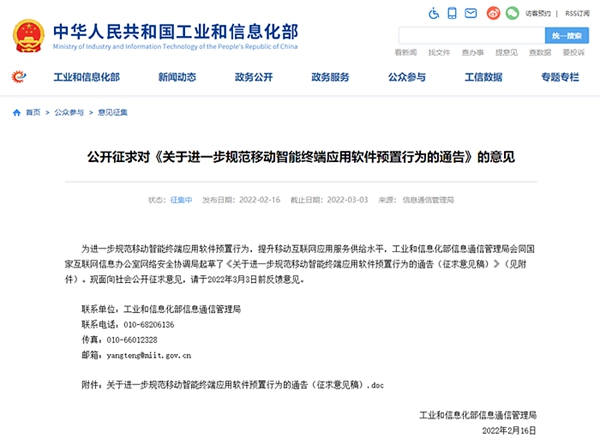 據(jù)工信部網(wǎng)站16日消息,工信部公開征求對(duì)《關(guān)于進(jìn)一步規(guī)范移動(dòng)智能終端應(yīng)用軟件預(yù)置行為的通告》的意見?!锻ǜ妗诽岢?,生產(chǎn)企業(yè)應(yīng)確保除基本功能軟件外的預(yù)置應(yīng)用軟件均可卸載,并提供安全便捷的卸載方式供用戶選擇。全文如下: