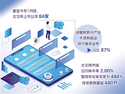 2021年11月15日,北京證券交易所正式揭牌開市,截至目前已滿3個月。記者日前獲悉,截至2022年1月底,北交所上市公司84家,戰(zhàn)略性新興產(chǎn)業(yè)、先進(jìn)制造業(yè)、現(xiàn)代服務(wù)業(yè)等占比87%;新三板創(chuàng)新層掛牌公司1221家、基礎(chǔ)層掛牌公司5694家,呈現(xiàn)出“金字塔”結(jié)構(gòu)。目前,符合北交所上市財(cái)務(wù)條件的掛牌公司超過千家。