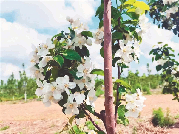 從尚志林場放眼望去,270畝寒地林果栽培示范基地在藍(lán)天白云的映襯下顯得頗為壯觀。龍豐、海棠、雞心果等萬余株寒地林果整齊排列,枝頭花朵競相綻放。