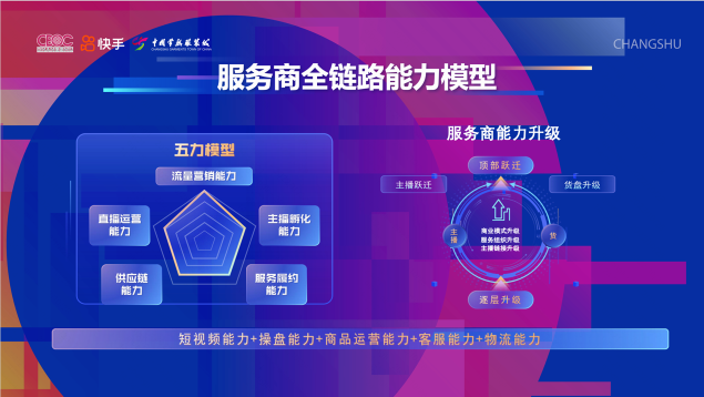 快手電商服務(wù)商則介紹了服務(wù)商全鏈路能力模型。針對商家主播能力弱、私域流量差、貨品不健全、投流ROI難提升等痛點,服務(wù)商可以發(fā)揮流量營銷、直播運營、主播孵化、供應(yīng)鏈、服務(wù)履約等全鏈路能力,助力商家冷啟孵化和躍遷。自今年3月底常熟服飾產(chǎn)業(yè)帶落地至今,快手服務(wù)商已服務(wù)500多個常熟商家,常熟當(dāng)?shù)乜焓謩愉N商家數(shù)提升30%+。