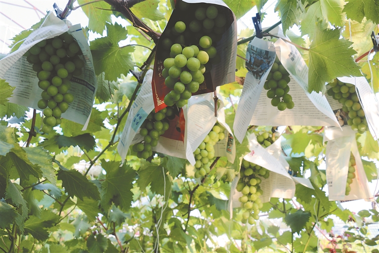 “‘陽(yáng)光玫瑰’是近幾年引進(jìn)的新品種,因其果肉多、甜度高、口感佳,受到不少市民的喜歡,每年都有不少商家、居民前來(lái)采購(gòu)。目前,‘夏黑’已處于成熟期,‘陽(yáng)光玫瑰’預(yù)計(jì)9月中下旬成熟。”曹偉勝介紹。
