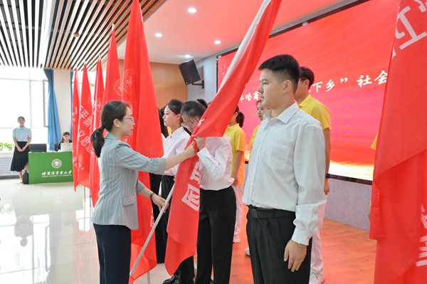 省希望工程捐助中心主任、省青少年發(fā)展基金會(huì)理事長(zhǎng)杜晶為哈爾濱商業(yè)大學(xué)2024年“三下鄉(xiāng)”社會(huì)實(shí)踐團(tuán)隊(duì)代表、“情暖童心·鄉(xiāng)伴童行”支教團(tuán)代表授旗,希望即將奔赴龍江大地的志愿者們能夠充分利用服務(wù)期,向下扎根、向上生長(zhǎng),踐行志愿服務(wù)精神,在奉獻(xiàn)與收獲中積累報(bào)國(guó)為民的樸素情懷,做有理想、有擔(dān)當(dāng)?shù)男聲r(shí)代青年。