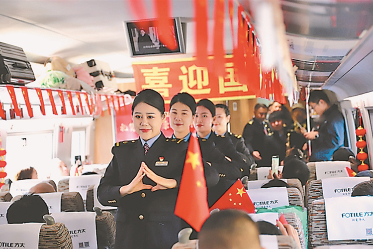G774次列車乘務(wù)人員與乘客一起聯(lián)歡。本報(bào)記者 王迪攝