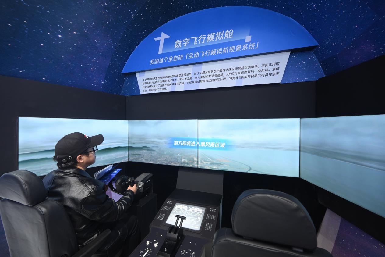 “只需要推動操縱桿,就能操作系統(tǒng),體驗民航飛行員第一視角下、擬真的訓(xùn)練場景……”在展區(qū)前方,由南航自研虛像顯示技術(shù)和騰訊自研游戲引擎技術(shù)共同打造的全動飛行模擬機視景系統(tǒng),吸引眾多參觀者體驗。基于騰訊自研游戲引擎,系統(tǒng)首次實現(xiàn)全局動態(tài)光照與地球級場景超寫實渲染,多邊形生成面數(shù)較之前提升380倍、貼圖精細度提升100倍,助力實現(xiàn)我國民航關(guān)鍵技術(shù)突破。