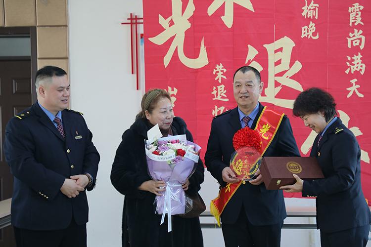 客運(yùn)段團(tuán)委書記張蔚萌代表段黨委,為馮春生同志送上誠摯的祝福,并鄭重地遞上鐫刻著“光榮退休”字樣的紀(jì)念牌。緊接著,班組精心準(zhǔn)備的一份“驚喜”將現(xiàn)場氣氛推向高潮——馮春生同志的愛人捧著鮮花,在大家的掌聲中走上臺(tái)來。夫妻二人相視而笑,這份來自家庭的溫暖與支持,讓馮春生同志感動(dòng)不已。