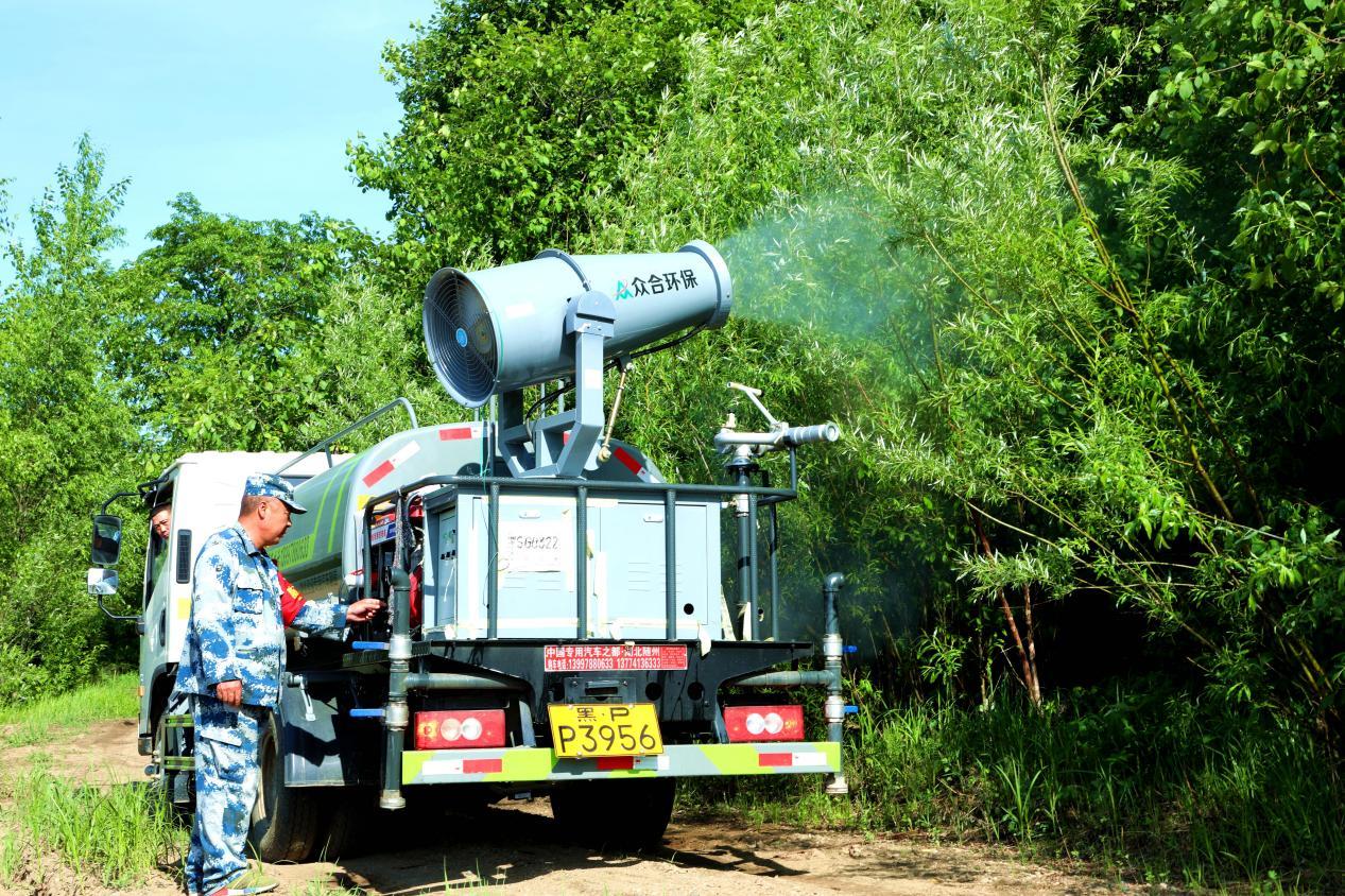 阿木爾林業(yè)局利用車載高射程噴霧機,防治稠李巢蛾有害生物(王力 攝)