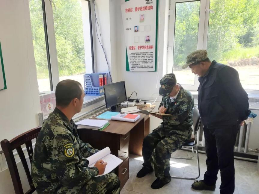 林業(yè)局工作人員在查看管護(hù)站入山人員登記情況(張凱強(qiáng) 攝)